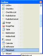 As shown above, we are using Fileupload control to browse picture files on hard disk. FileUpload control is a composite control which includes a textbox and browse button together. To add this control, simply drag and drop FileUpload control from Toolbox as shown below.